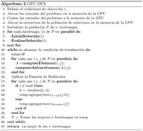 El Algoritmo de Luciérnaga Discreto (DFA) es una variación del FA canónico utilizado para problemas combinatoriales el cual ha sido exitoso en diversos campos de aplicación [16,22]. El DFA es el modelo base utilizado en el presente trabajo para la implementación sobre GPU. Esta sección presenta nuestra propuesta algorítmica la cual llamaremos GPU-DFA.