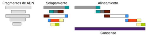 Para medir la calidad del consenso se observa el llamado cubrimiento ( Coverage ). El cubrimiento de una posición base está definido como el número de fragmentos que comparten esa posición. Esta es una medida de redundancia de un fragmento de dato y denota el número de fragmentos, en promedio, donde un nucleótido se espera que aparezca en el ADN. Esto se calcula como el número de bases leídas por fragmento sobre el tamaño del ADN obtenido. En la Fig. 1 se pueden observar los pasos usuales de las técnicas de ensamblado.