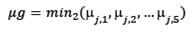 Once the five values of ( per suspect have been calculated in the previous block, the following step consists in determining a unique value per suspect related to the global similarity between him(her) and the audio proof. According to preliminary tests, it was found that a good operator among values of (j,i (for the same suspect) is the min function. However, it is neccesary to take into account that audio recordings with bad quailty can give low values of NC and then low values of (. A solution is to calculate the second-lowest value (min2) of (j,i , for i [1 to 5] and j as the number of suspect. Therefore, output of this block is the global similarity ( (g ), calculated as follows: