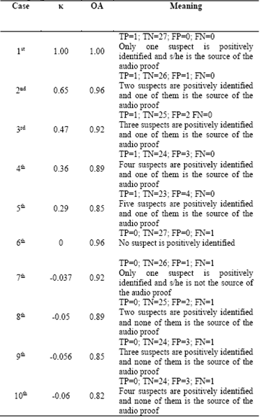 When evaluating the accuracy of the proposed method, 10 different cases were detected. Table 1 shows the meaning of each case in terms of κ and OA. According to the results, OA and κ are equal to 1 if and only if the performance of the system is perfect (1st case); it means the system identifies only the correct source of the audio proof. If the system identifies two suspects positively, i.e. the correct source and one incorrect source of the audio proof (i.e. the 2nd case), values of OA and κ are 0.96 and 0.65, respectively.