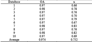 According to the results of Table 2 (i.e. κaverage=0.752; OAaverage=0.974), the system is expected to mostly work between the 1st and the 2nd cases of Table 1.