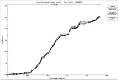 Con el hidrograma generado por la rotura como dato de entrada en el modelo, la simulación de la propagación de la avenida se ha calculado con HEC-RAS (4.1.0) sobre un modelo territorial que intentaba reproducir las condiciones espaciales y geoambientales. Se parte de la ventaja que supone la prácticamente nula intervención que ha tenido este espacio natural a lo largo de los últimos 55 años. El resultado esperable será la cronología de la onda de choque inicial hasta alcanzar la población de Ribadelago. La onda estará determinada a partir de: la media de las velocidades de paso por cada uno de los perfiles, la distribución espacial de la zona inundada y el poder destructivo estimado en función de la relación velocidad calado.