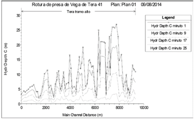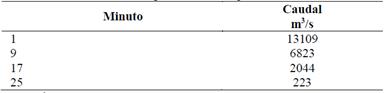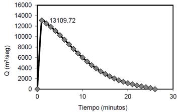 De acuerdo a este hidrograma la punta se origina en el primer minuto, coherente con la hipótesis de rotura instantánea y el agotamiento del embalse se produjo en 26 minutos desde el inicio. Analizando la forma del hidrograma de avenida generada, corresponde al esperable en la rotura de una presa de hormigón (similar a los existentes en la literatura), y supondría la generación de una onda de choque inicial de gran magnitud (13109 m3/s) y poder de arrastre con un rápido descenso hasta su agotamiento en 25 minutos [22].