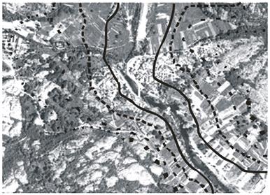 importante reducción de la velocidad, y del calado así como de la capacidad de arrastre, extendiéndose la inundación a lo ancho de la llanura. Se ha reconstruido la línea de la zona inundada en la llanura de Ribadelago, a partir de tonalidades más claras y la ausencia (por arrasamiento) de texturas características de zonas agrícolas de minifundio (Fig. 8), se observa el ensanchamiento de la avenida a lo largo de la llanura, con afecciones más fuertes en la parte del pueblo situada en la margen derecha, y en la que se atisba la posibilidad de que una parte de la avenida drenase en parte por el pequeño cañón situado en la margen izquierda del río e inmediatamente aguas arriba de Ribadelago, comunicando directamente por el lago.