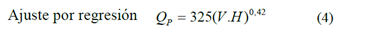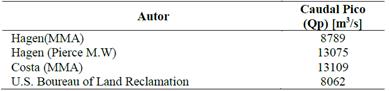 Para la estimación de los caudales punta generados en la brecha de Vega de Tera se han analizado comparativamente las ecuaciones de Hagen (Eq.2), en las versiones de Pierce M.W. y del Ministerio de Medio Ambiente, la de Costa (Eq.3,4) y la del U.S. Boureau of Land Reclamation (Eq.5).