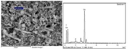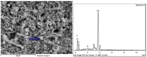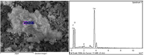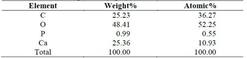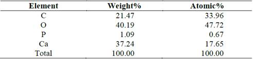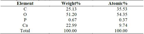 Fig. 7 and Table 4 shows the microchemical analysis of the surface of a shell (assay 0.4% T). The highest calcium peak indicates a higher purity in the structure. Notwithstanding, the high carbon content indicates the presence of residual organic matter in the surroundings.
