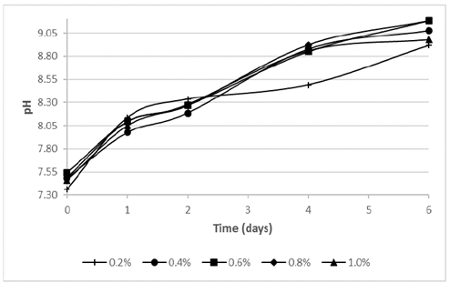 Although the assays using a tryptone concentration ≥ 0.4% tended to stabilize at day 6 of the process, the assay using 0.2% of tryptone decreased its raising from the second day. The final pH for all assays were around 9 and the highest values were achieved by the assays using tryptone concentrations of 0.6% (9.19) and 0.8% (9.18), followed by the 0.4% (9.08), 1.0% (8.98) and 0.2% (8.92) tests.