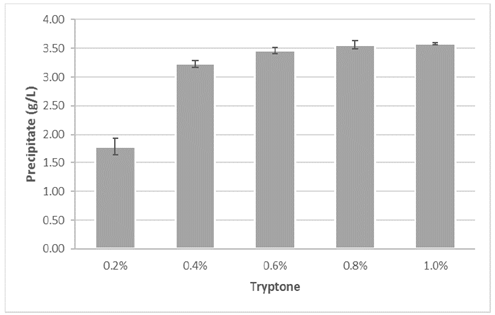 Fig. 2 presents the quantity of precipitate obtained in each assay. The assays with tryptone concentration higher than 0.4% obtained values above 3.2 grams of precipitate per liter of solution. The highest precipitate quantity was obtained in the assays with 0.8% (3.56 g/L) and 1.0% (3.58 g/L). In contrast, the assay using 0.2% tryptone obtained the lowest precipitation, 44.5% lower than the experiment with the subsequent precipitate concentration (3.23 g/L).