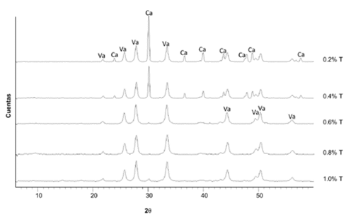 Figure 3: Diffractograms of the precipitates for each trial at different tryptone (T) concentrations. Va: vaterite, Ca: calcite