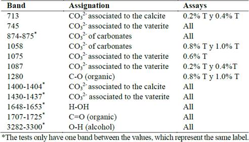 Fig. 4 shows the FTIR spectra for all the precipitates and Table 2 presents the bands identification with their respective assignations. The presence of calcite and vaterite was validated for all assays. The band at 713 cm-1, corresponding to calcite, indicated the greatest presence of this mineral in the assays with 0.2% and 0.4% of tryptone. The bands at 1280 cm-1 and 1707-1725 cm-1 indicated that the precipitates had traces of organic matter after the washing phase, probably originating from one of the compounds of the cultivation medium. The band at 1648-1653 cm-1 signaled the presence of natural humidity of the sample and the band at 3282-3300 cm-1 indicates interactions of O-H, possibly corresponding to the to the residual alcohol from the washing phase of the precipitates [21,22].