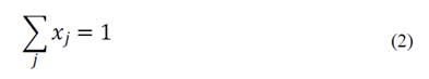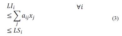 Where x 𝑗 corresponds to the amount of each ingredient j, 𝑐 𝑗 is the unit cost of an ingredient j and 𝑎 𝑖𝑗 the fraction of component i in the ingredient j. 𝐿𝐼 𝑖 and 𝐿𝑆 𝑖 are the lower and upper limits of quality for each component i.