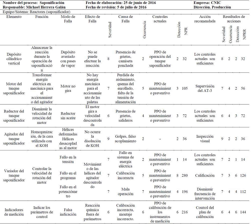 El primer resultado está dirigido a identificar los equipos y sistemas en cada área productiva. Se describe su función principal, modo, efectos, causa de la falla potencial, los controles asociados a los activos; así como el número de prioridad de riesgo (NPR) y el número de prioridad de riesgo residual (NPRR). En la Tabla 6, se muestra el resultado del análisis en el área de saponificación (reacción química). Es válido destacar que el procedimiento planteado es el mismo para todos los activos de la empresa. A modo resumen solo se ilustra el resultado en un tipo de activo (los reactores químicos).