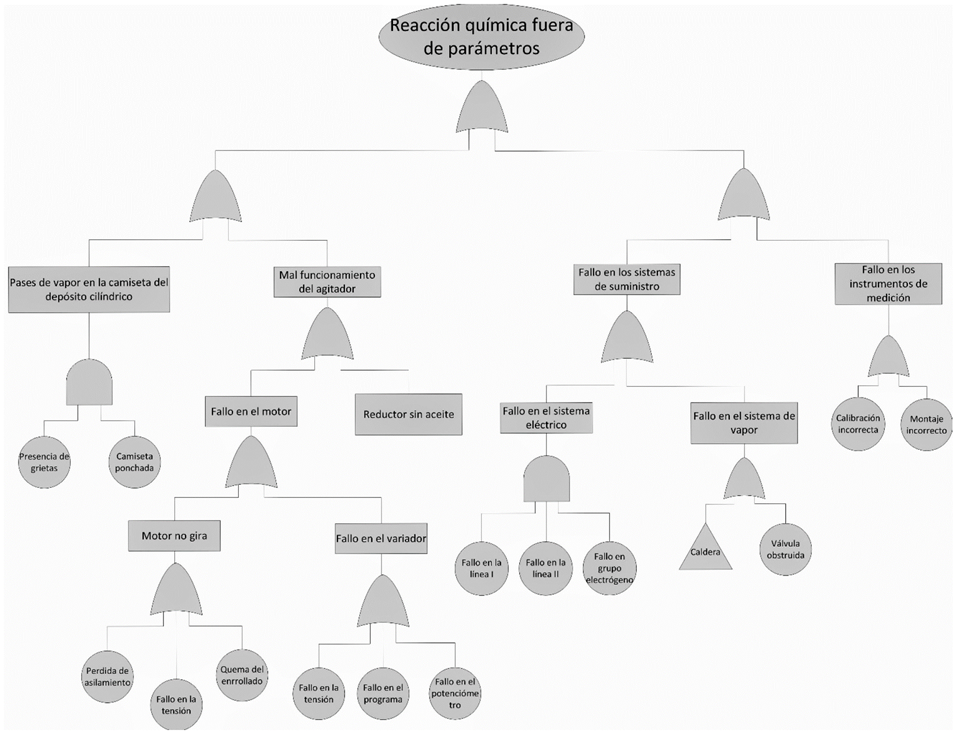 La Fig. 1 muestra el árbol de falla para el reactor químico. Los árboles de fallas son representaciones gráficas organizadas que representan los factores causantes de un resultado adverso, definido como evento máximo. En el estudio se utilizó con el objetivo de representar de forma gráfica la secuencia de eventos que provocan la falla final del activo después de aplicar las medidas de control. En otras palabras es la técnica que se utilizó para la supervisión y control del riesgo residual.