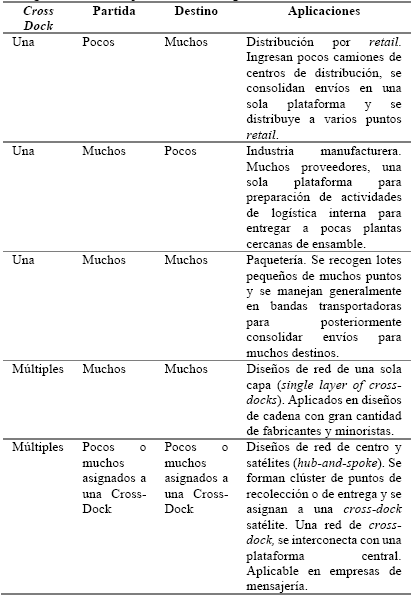 En [15] se propone una clasificación de plataformas Cross-Docking de acuerdo con unos criterios tales como: características físicas, operacionales y de flujo.
