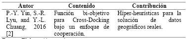 A continuación, en la Tabla 2 se presentan las investigaciones más relevantes acerca de Cross-Docking, dentro de la ventana de observación propuesta en este trabajo. En esta sección no se tiene en cuenta el problema de ruteo de vehículos. Esta es una revisión complementaria al objetivo principal de revisar el estado del arte de estos dos conceptos en conjunto; la finalidad es establecer posibles campos de investigación futura y la concentración en tópicos que son tendencia.