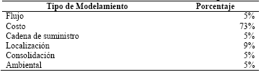 A continuación se presentan diferentes formulaciones y métodos de solución para Cross-Docking con ruteo de vehículos. Para clasificar los trabajos de acuerdo con el tipo de modelo planteado, se crearon seis (6) categorías: modelos que maximizan el flujo de material (Flujo), modelos cuya función objetivo es una función de costo (Costo), modelos de aplicación a cadenas de suministro (Cadena de suministro), modelos de localización de una o varias plataformas (Localización), modelos de consolidación de mercancías (Consolidación) y modelos con consideraciones ambientales (Ambiental). La Tabla 4 presenta las frecuencias observadas en los trabajos reportados.