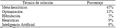 La Tabla 5 propone una clasificación en cinco categorías (Meta-heurísticas, optimización, hibridación, heurísticas e inteligencia artificial) con respecto a los métodos de solución, en la cual se evidencia que cerca de la mitad de los artículos revisados, aplican meta-heurísticas como estrategia para resolver este tipo de formulaciones.