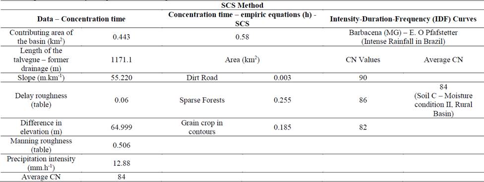 The Soil Conservation Service (SCS) method (United States Department of Agriculture) was used with the ABC 6 software for calculating excess rain from the hydrogram considering 30-minute discretization intervals and varying the return period for 5, 10, 15, 20 and 25 years considering a first-order basin. This method allows for assigning the variables identified in the field using the variables of the Intensity-Duration-Frequency (IDF) equation for Barbacena-MG, a city near Nazareno, and the Curve Number (CN) values.