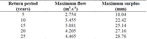 Table 2: Maximum flow rates and precipitation surplus for each return period considered - ABC 6 (Cravo Stream gully contributing basin, Nazareno-MG).