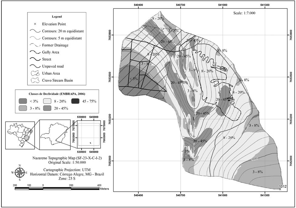 The steepness classes identified for the Cravo Stream Basin are shown in Fig. 2. The slopes are predominantly from 8 to 20% in the area (56.5%), followed by a steepness class that includes slopes ranging from 3 to 8% (22.6%). Note that the area corresponding to the Cravo Stream gully has slopes between 20 and 45%.
