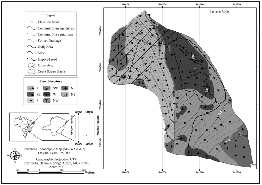 The objective of this study was to develop a proposal for macrodrainage as an initial concept for a low-cost project through the use of the two software tools discussed above, which were applied as part of a case study of the Cravo Stream gully (Nazareno-MG). This area was chosen because there is a lack of studies regarding its surface water drainage and because Nazareno is an example of how land uses influence soil erosion in a susceptible environment, similar to other cities in Brazil [14].