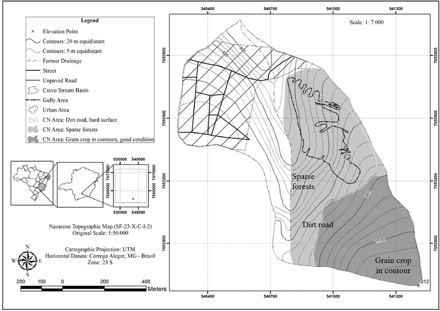 The average CN of the basin was calculated based on information about the study area (land use and soil type) and considering the average soil moisture conditions. The IDF equation values, as well as the average CN, were obtained using the original data embedded in the software. A land use map of the Cravo Stream gully contributing basin was prepared as part of the evaluation.