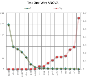 Los gráficos correspondientes a los valores de la Tabla 6 permiten visualizar de mejor manera el grado de influencia de los factores de entrada en el modelo. En el caso del F de Fisher (Fig.19), para valores bajos, empiezan a perder influencia los factores; el caso del Lambda de Wilks (Fig.20) es en sentido inverso, a partir de cierto valor (alto) los factores ya no aportan. El punto de corte se establece en valores de significancia por encima de 0.10, en este caso, a partir de la variable prft.