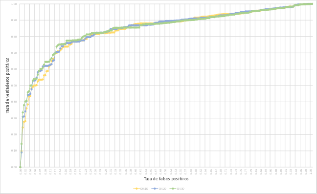En cuanto a sus capacidades de clasificación, en la Fig.23 se presentan las curvas ROC obtenidas para cada modelo. La curva es un dibujo de la probabilidad de tener un verdadero positivo (un valor correctamente predicho) versus la probabilidad de un falso positivo (un valor incorrectamente predicho). Un modelo ideal muestra un valor del área bajo la curva AUC cercano a 1, mientras un valor cercano a 0,5 evidencia un inadecuado modelo.