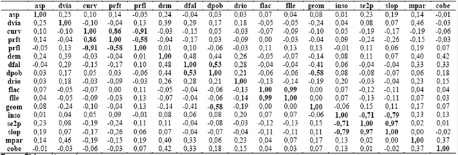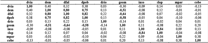 La correlación de los predictores o colinealidad se evalúa usando la matriz de covarianza entre grupos (Tabla 7). Una inspección de la correlación de las covarianzas muestra las correlaciones altas entre los predictores dem, dfal y dpob, y slop e inso.