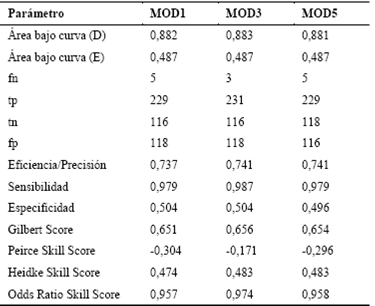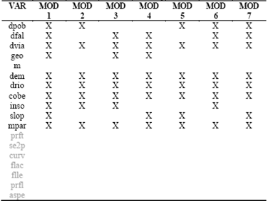 Se han elaborado siete modelos diferentes cambiando las variables incluidas en cada caso y se ha probado el desempeño en la clasificación de los datos. La configuración de cada uno de los modelos probados se presenta en la Tabla 16. El modelo MOD1 ya se presentó junto a la descripción del procedimiento en la Fig.21.