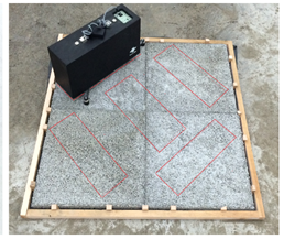 A performance standard (ABNT NBR 15575:2013) points out the impact sound test procedure referenced by ISO 140-7 [20] and ISO 717-2 [21]. Tests were performed in overlapping rooms, separated by reinforced concrete slabs with 10 cm thickness, with masonry walls and solid bricks coated with mortar. The emitting and the receiving rooms have a 16.24 m² floor area and 44.82 m³ volume. The tested sample was of 1m², which was constituted of four 50 cm x 50 cm slabs. The samples reduced dimensions met cost reduction, time and waste production requirements designed by this research [11], Fig. 1.