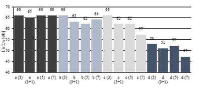 Among the variables that were analyzed, differences in ratios of conventional and EVA aggregates were determinants to the samples’ acoustic performance, except for the 3cm thickness, which showed certain constancy. Other thickness levels present higher impact sound values for smaller specific masses, that is, for a smaller quantity of EVA coarse aggregate. This behavior intensified for the 7cm thickness, as observed in Fig. 3. Fig. 7 shows mean impact sound pressure levels for samples that were tested.