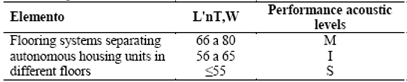 Concerning flooring systems requirements, ABNT NBR 15575 (2013) [7] sets performance acoustic levels, as minimum (M), intermediary (I) and superior (S), according to Table 1. These requirements must be met in all housing buildings.