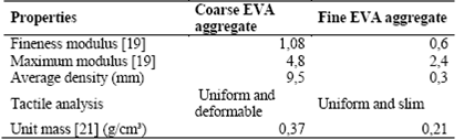 It was carried out coarse and fine EVA aggregates characterization for dimensional, tactile, particle size distribution and unit mass analyzes. Results obtained in the materials characterization are presented on Table 4.