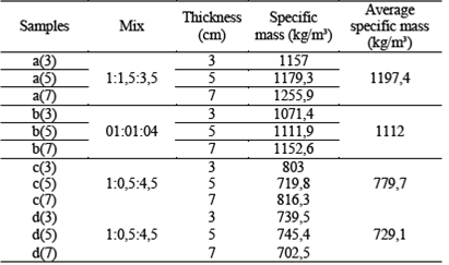 The samples of subfloors specific mass tests (ABNT NBR 9778:2009) [22] were performed after 28 days of setting, and results are shown on Table 6.