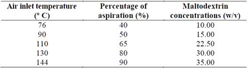 Table 1: Independent variables real levels for spray drying technique with Maltodextrin -Inulina