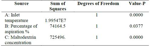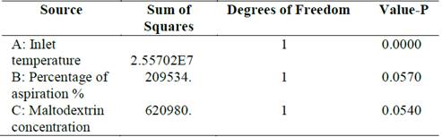 Lactic bacteria however, showed a significant difference (p <0.05) for the CFU counts with respect to temperature, the rate of aspiration and concentration of maltodextrin (Table 3). Similarly, analysis of variance for viability carried out between these groups of bacteria showed a significant difference (p <0.05).