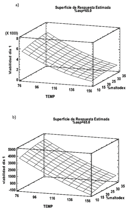 Variables values that optimized microorganism’s viability in the microcapsules were: temperature 76 °C, percentage of aspiration of 60 % and maltodextrin concentration of 35 % w/v, with a count of 6.7x106 CFU / g for Bacillus and 5.4X106 CFU / g for Lactobacillus (Fig. 2).