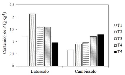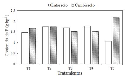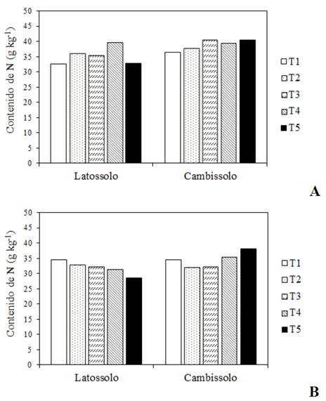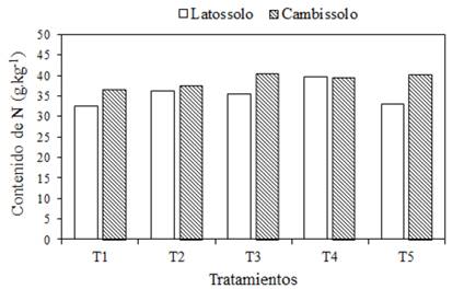 38,11 g kg-1 y menores para los tratamientos T2 y T3, con 31,96 y 32,22 g kg-1, respectivamente. Se observó también un incremento de N en las plantas, en el orden de: 10,72; 4,11; 12,62 y 18,55% sometidas a los tratamientos T1, T2, T3 y T5, comparado con las plantas cultivadas en el “Latossolo”. Esto puede ser explicado por la mayor disponibilidad de nutrientes para la planta en el “Cambissolo”, en virtud de que este suelo presenta mayor cantidad de materia orgánica, además de poseer una mayor capacidad de retención de sales provenientes del agua residual.