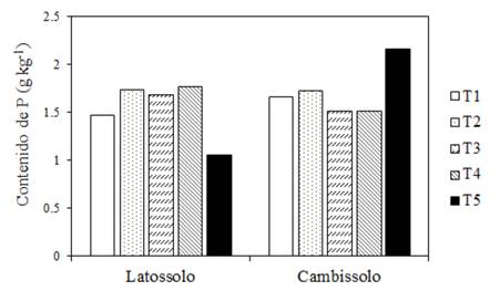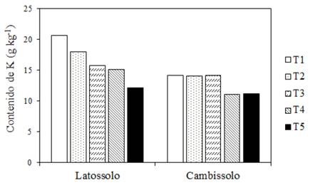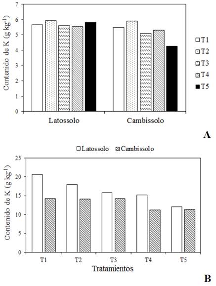 Analizando los efectos de los tratamientos con y sin agua residual en los suelos estudiados, se verificó que la mejor respuesta de las plantas a la acumulación de ese nutriente fueron en aquellas cultivadas en un suelo arcilloso (“Cambissolo”), donde se destacó el tratamiento convencional, o sea, sin agua residual (T5) con ganancia porcentual de 30% en comparación con T4 (Fig. 5). Los contenidos medios en todo el experimento variaron entre 1,06 y 1,77g kg-1 para el “Latossolo” 1,52 a 2,16 g kg-1 para el “Cambissolo”. No obstante, los valores encontrados para el “Cambissolo” fueron superiores al “Latossolo”, donde están próximos al rango inferior al recomendado por Rosolem et al. [21] que obtuvieron contenidos entre 2,3 y 2,6 g kg-1. Siendo que el rango obtenido en este experimento se encuentra debajo de los resultados obtenidos por Serra et al. [23].