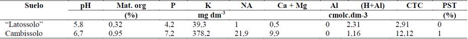 Se retiraron submuestras de cada tipo de suelo para la caracterización física (granulometría, densidad aparente y porosidad) siguiendo metodologías recomendadas por la EMBRAPA [7]. Además, se determinó la capacidad de retención de agua de los dos suelos, siendo que esa información fue utilizada en la planilla de riego.