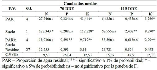 De acuerdo con el análisis de varianza (Tabla 4), donde se considera los contenidos de N, P y K en la hoja a los 70 DDE, se verificó que hubo una interacción significativa entre las proporciones de agua residual aplicadas y los tipos de suelos para los contenidos de P y K al nivel de 5% de probabilidad, y efecto significativo independiente para las proporciones de agua residual únicamente para el contenido de K. Con relación a la fuente de variación tipo de suelo ocurrió un efecto significativo para el N y el K al nivel de 1% de probabilidad.