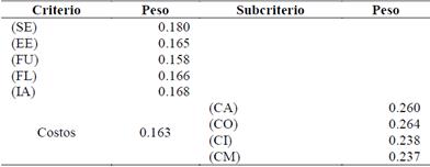 Para la obtención de los resultados finales hemos considerado la ponderación presentada en la Tabla 3. El peso del criterio Costo de Mantenimiento, dado que fue eliminado, se ponderó entre los otros costos.