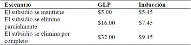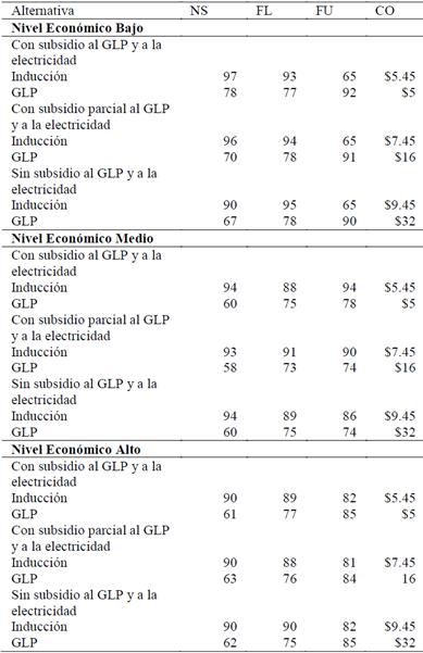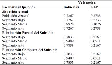 Al analizar los resultados se evidencia que en cualquier caso la cocina de inducción muestra o indica mejores preferencias. No obstante se puede observar que existe un incremento en esta preferencia cuando el subsidio al GLP es eliminado de manera parcial o total.
