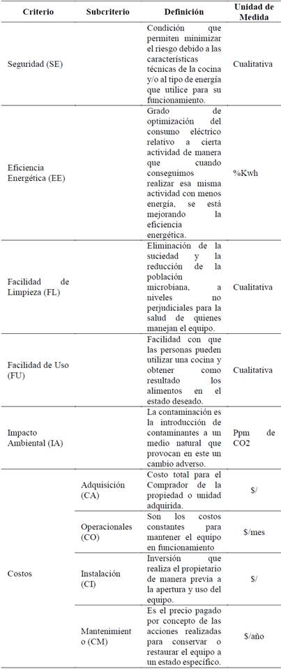 Consiste en la definición de los elementos principales que caracterizan el proceso de compra de una nueva cocina. Para llevar a cabo esta actividad se consultaron diferentes bases de datos, como: manuales de cocinas, entrevistas con técnicos eléctricos, funcionarios de empresas eléctricas, artículos especializados [12]. Como un resultado importante de esta etapa se reconocieron los aspectos: sociales, económicos, de impacto ambiental, que están directamente relacionados al problema. Todo lo cual se realizó considerando el proceso de validación de criterios definido en [5], en el cual se consideran aspectos tales como: