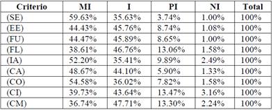 En éste estudio hemos procedido a validar y ponderar los criterios simultáneamente mediante una encuesta dirigida a la población en general, en la cual los encuestados seleccionan la opción que mejor les parezca en una escala Likert de cuatro dimensiones: Muy Importante (MI), Importante (I), Poco Importante (PI), Nada Importante (NI). La Tabla 2 presenta los resultados obtenidos del experimento, que consistió en aplicar 1.200 encuestas de forma estratificada, tanto en la región urbana como rural de la ciudad de Cuenca.