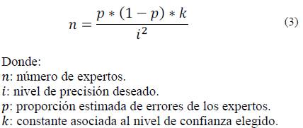 En este paso, primeramente, se debe calcular la cantidad de expertos que intervienen en la investigación. Los autores, utilizando un método probabilístico y asumiendo una ley de probabilidad binomial, proponen la ec. (3) [39]: