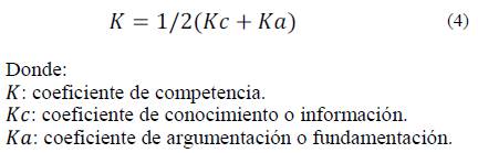 Luego es necesario identificar dentro de un grupo de expertos preseleccionados, aquellos que posean los conocimientos necesarios. Los autores proponen utilizar el método propuesto por [40-41] para calcular el coeficiente de competencia tal y como muestra la ec. (4):
