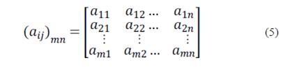 Al evaluar cada criterio de decisión se conforma una matriz de decisión 𝐴 𝑚𝑛 donde cada elemento 𝑎 𝑖𝑗 ∈ 𝐴 𝑚𝑛 y representan las evaluaciones emitidas por el experto a cada FCE en cada criterio, donde en las filas se ubican los Factores Críticos de Éxito (𝐹𝐶𝐸= 𝐹𝐶𝐸 𝑖 ∀ 𝑖=1,2,…,𝑚) y en las columnas cada uno de los criterios evaluados (𝐶= 𝐶 𝑗 ∀ 𝑗=1,2,…,𝑛), tal y como muestra la ec. (5).