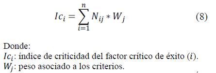 Al realizar los cálculos con valores normalizados se obtendría un índice de criticidad, que tendría valores entre 0 y 1 (0≤ 𝐼𝑐 𝑖 ≤1) para cada Factores Critico de Éxito. Los FCE con un mayor 𝐼𝑐 𝑖 serían los más importantes para la organización.
